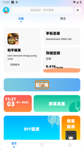2.核心功能入口:进入软件主界面,可以看到广角助手、地铁亮度、屏幕准心、DIY画质等核心功能模块的入口图标。