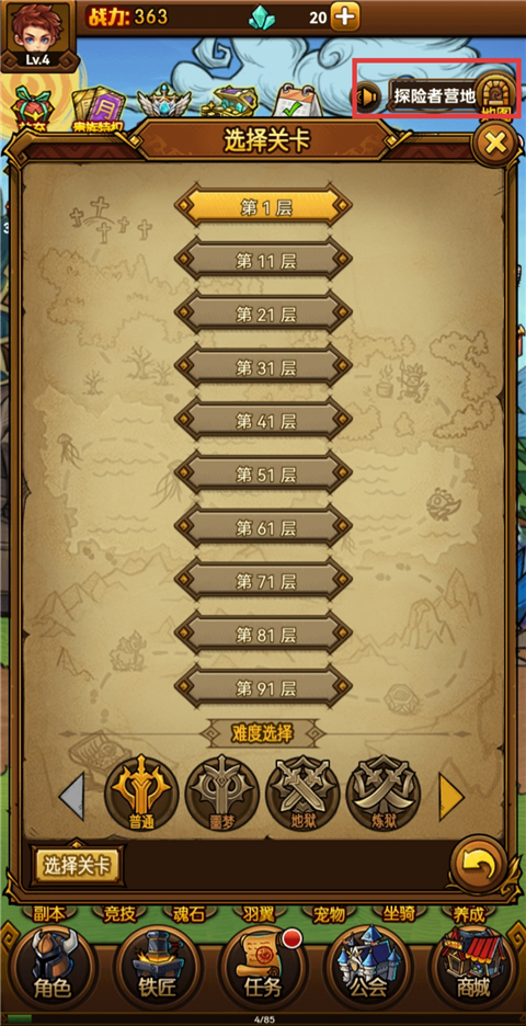 1、进入时空神域,点击探险者营地,选择关卡进入。