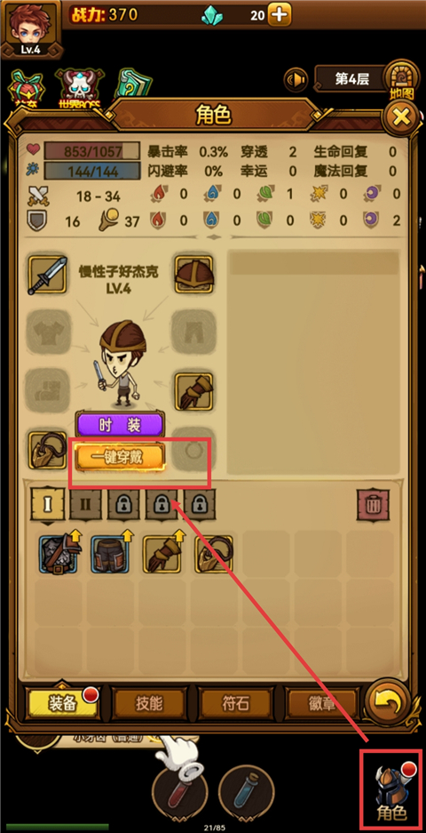 5、收获了装备后,点击右下角【角色】可一键穿戴装备。
