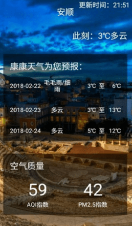 1.软件采用了动态背景效果,界面会依据当前的天气状况和昼夜变化呈现不同的视觉主题。