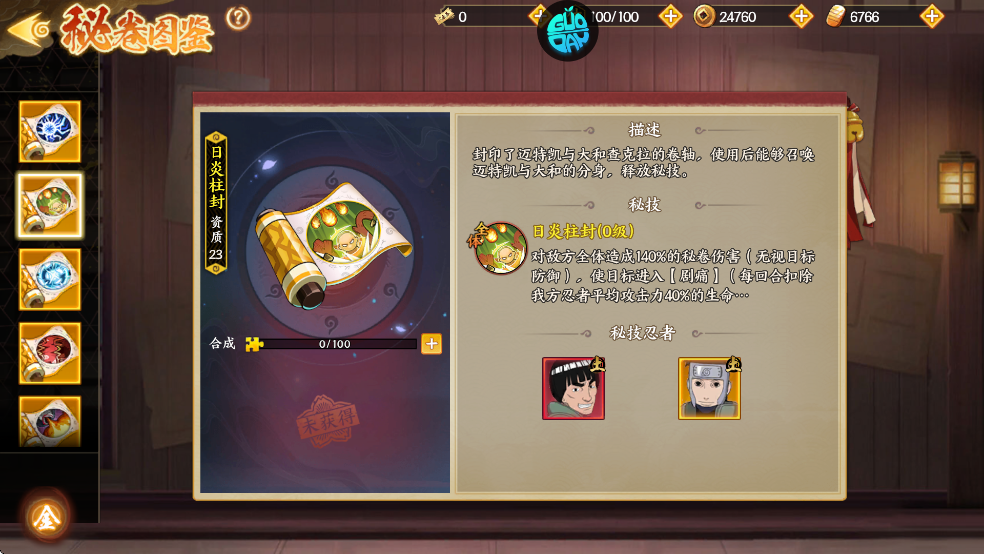 封印了迈特凯惊门与大和查克拉的卷轴,使用后能够召唤迈特凯惊门与大和的分身,释放秘技。