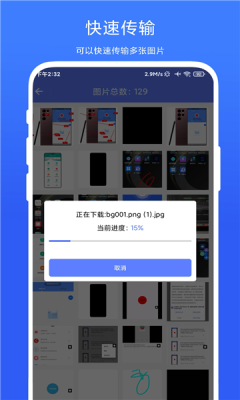 5.执行传输:确认选择后,点击传输按钮,选中的图片便会开始向电脑传送,等待进度完成即可。