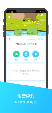 2. 智能语音即时反馈:集成先进的语音识别技术,能够对孩子的跟读和发音进行实时评测并给出分数,让口语练习有了量化的参考标准。