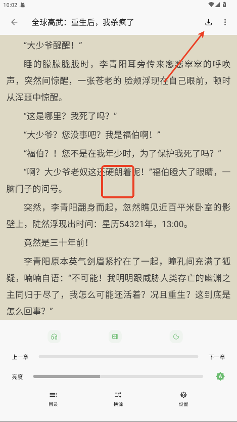 1.进入阅读界面,点击屏幕中间,呼出菜单栏,点击右上角下载按钮