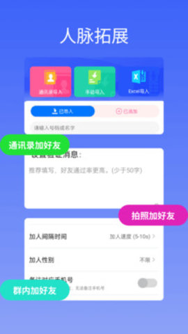 1.多源客源拓展:软件整合了通讯录导入、群成员提取及基于位置的附近用户添加等多种方式,为私域流量池的构建提供多元化入口。