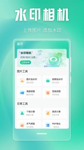 1.实时拍摄加水印:打开软件后直接使用拍摄功能,在取景框内即可预览并选择喜欢的水印模板,按下快门后,一张带有时间地点水印的照片便直接保存至相册。