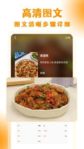 4.支持将菜谱以纯文本或图片形式分享到其他社交平台,方便与朋友交流厨艺。