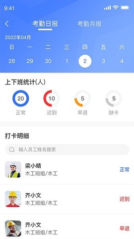 1.视频考勤功能让工人通过人脸识别完成打卡,数据实时同步,杜绝代打卡现象。